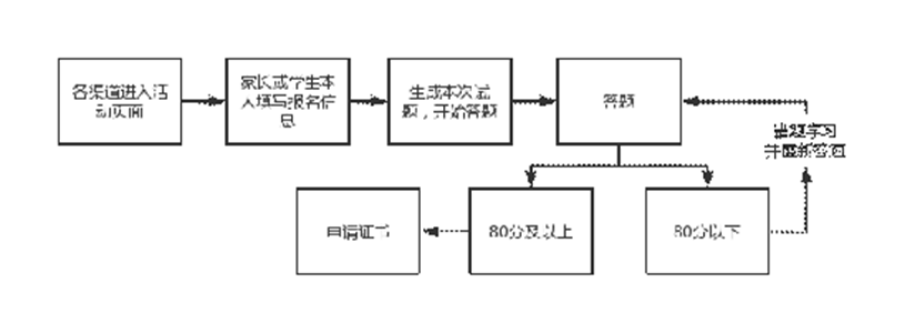 学生及家长通过关注微信公众号或扫描二维码进入云答题活动页面后,按照活动指引进行学习和答题操作,具体流程如下图所示: